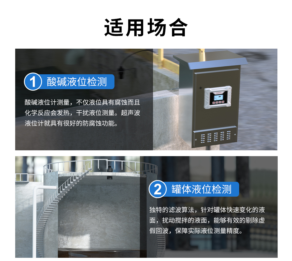 應用行業 利用超聲波在遇到不同密度的液介質(固介質)分界面時發生反射,通過測定傳輸時間來測量液位/距離。